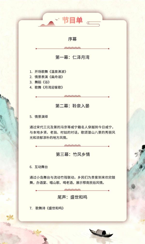 “这将不仅仅是一场演出,更是一次对咸宁诗意山水的深度解读。”活动主办方表示,《温泉沸波》旨在将独特的地方文化符号,转化为可感、可触的艺术语言,让游客在45分钟的旅程中,读懂咸宁的千年泉韵与人文底蕴。