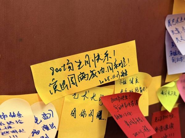 签到墙上留言贴纸被围出“800”字样,一字一句满是深情;盖章点前观众们排起长队,只为留下“今日份”的特殊纪念。二楼的道具服装展示区前队伍更长,李侠的长衫、兰芬的旗袍静静陈列,黄包车停在一旁,每一件物品都在喧闹的人潮中默默讲述着作品台前幕后的动人细节。