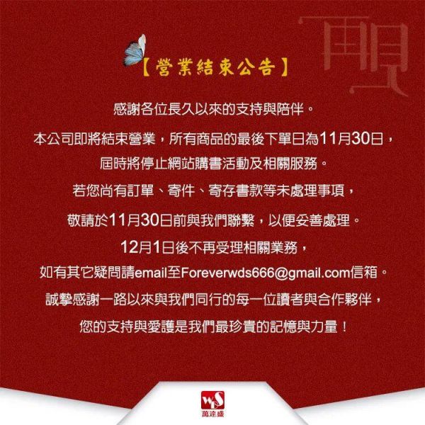而就在两天前,11月17日,席绢所在的出版方——中国台湾万达盛在其网页和社交媒体上发布“营业结束公告”,宣布今年11月30日将停止网站所有购书活动和相关服务。