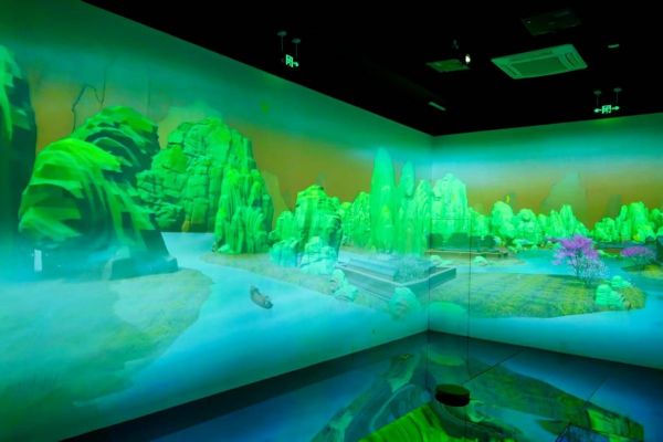 盛唐的风穿越千年,停驻在西安博物院二楼展厅。“风雅长安——王维文化艺术数字沉浸展”以科技为笔,让诗画巨匠的山水意境在当代重生。技术修复的《辋川图》在屏幕上流转生姿:春时桃花轻落泛动涟漪,秋日枫叶染红山林,与“荆溪白石出,天寒红叶稀”的诗句精准呼应。观众穿行其间,仿佛踏足辋川溪畔,呼吸间满是大唐风雅。