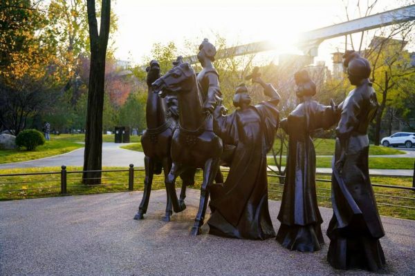 曲江池畔,韩愈“曲江水满花千树”的诗句刻于青石,“曲江水满”雕塑再现诗人邀友同游的场景。不远处,杜甫“江头醉归”、李商隐“怅望江头”的群雕与诗碑错落分布,盛唐文人雅集的记忆通过场景创新重现。这种诗意渗透在城市每个角落:“长安食记”的餐馆招牌、印着诗句的文创器皿、公园树上垂挂的诗牌,让市民日常与唐诗不期而遇。