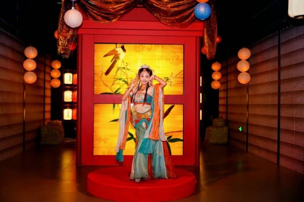 若说博物院是诗意的细腻铺陈,曲江飞行剧院则以冲击力十足的演绎让唐诗意象“动”起来。刚入大厅,弧形屏上的亭台雅乐、胡舞霓裳便扑面而来。廊道中,光影勾勒的“李白”款步而出,吟诵“云想衣裳花想容”,游客应声附和“会向瑶台月下逢”,诗意在互动中生长。