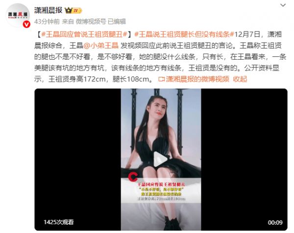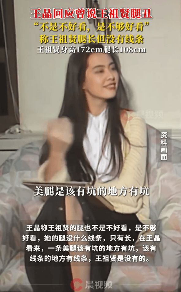 12月7日,王晶发视频回应曾说王祖贤腿丑的言论,他称对方腿不算难看但不够美,仅有长度却无线条,还表示美腿需有凹凸线条感,而王祖贤并不具备。公开资料显示,王祖贤身高172cm,腿长108cm。