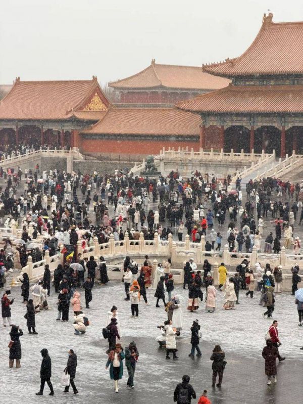 上午11时许,故宫已飘起雪花。不少观众停下脚步,拍照、拍视频,打卡雪中故宫。记者注意到,已有不少游客身着古装,在红墙外拍照留念——或头戴点翠、身披绛红斗篷,化身“格格”漫步雪中;或梳起旗髻,在飞雪中定格“清宫梦”,与雪中宫苑相映成趣。冬日古风打卡正成为初雪时节的新潮流,美团数据显示,12月第二周以来,“故宫妆造”搜索量环比上周激增超67%。