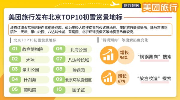 12月12日,北京今年入冬以来的初雪如约而至。故宫红墙金瓦与皑皑白雪相映成趣,成为年轻人迎接初雪的仪式感地标。美团旅行数据显示,近三天,“故宫博物院”搜索量环比上周上涨近60%。