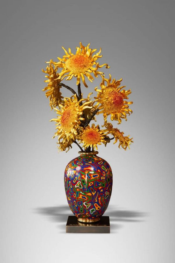 此次入藏的《千浪卷雪》《万里长城》《千里江山》等作品立意高远,气势磅礴,彰显中华美学的雄浑气魄;《国鹿》《青花铜瓶》源于传统,分别以独特的“动感”塑造和精妙的色彩搭配,凸显创新意义;《燃烧的向日葵》以鲜明的创新特质见长,运用熔铜手法塑造了富有生命力的向日葵形象,不仅体现中华美学意蕴,而且富有现代气息,形成与西方艺术的对话。