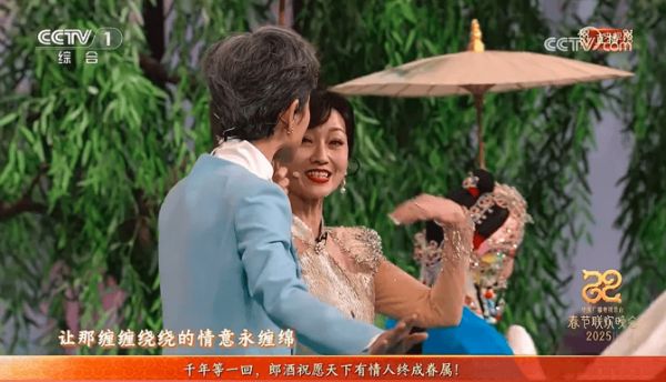 在2025年春晚上,红花郎不仅以“巳巳如意、神采飞扬”合作身份抢占主持背景板等黄金广告位,更深度融入蛇年限定节目《借伞》,以“郎”字灯笼、场景植入等形式,化身许仙与白娘子爱情故事的“醉美红娘”,伴随老戏骨赵雅芝、叶童的“世纪合唱”送出“天下有情人终成眷属”的祝福,屡屡出圈。