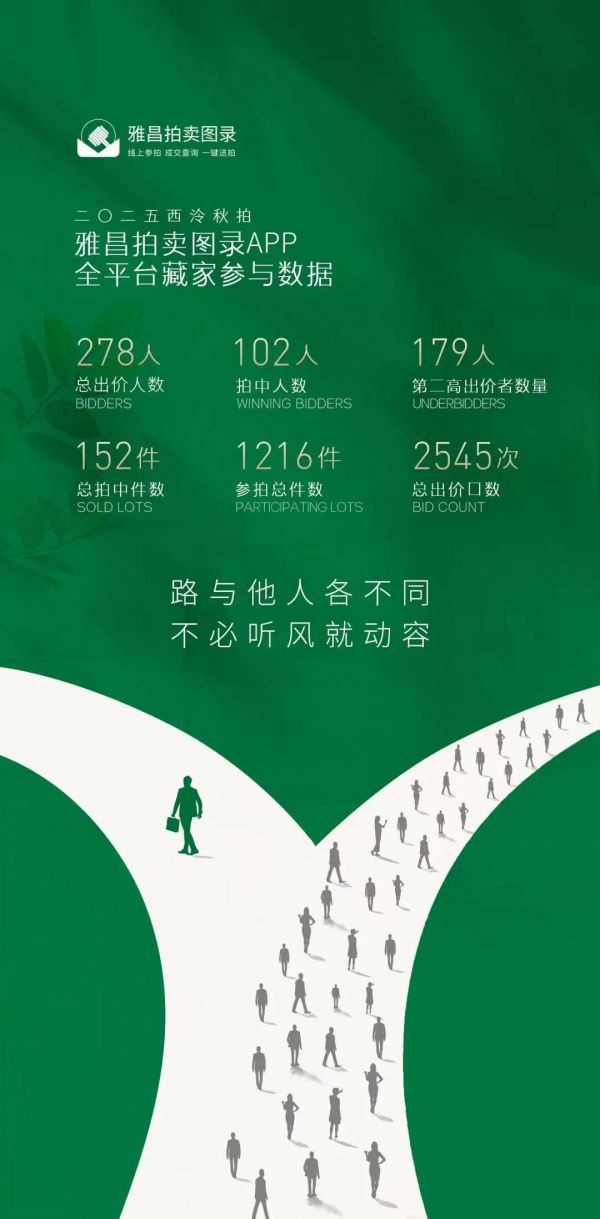 本季西泠秋拍,共有278位藏家通过雅昌拍卖图录APP在线参与中国书画、油画·现当代艺术、印砚、瓷器、文玩、佛像、名人手迹、古籍碑帖、玉器珠宝、名酒等18个品类,25个专场的1216件标的,总出价达2545口,最终有102位藏家成功竞得152件标的,带动近800万成交额,同比涨幅高达70%。更有 179位藏家竞价至第二高,哪怕未最终得手,这份“不盲从、不跟风”的执着,恰是“路与他人各不同”的生动注脚。