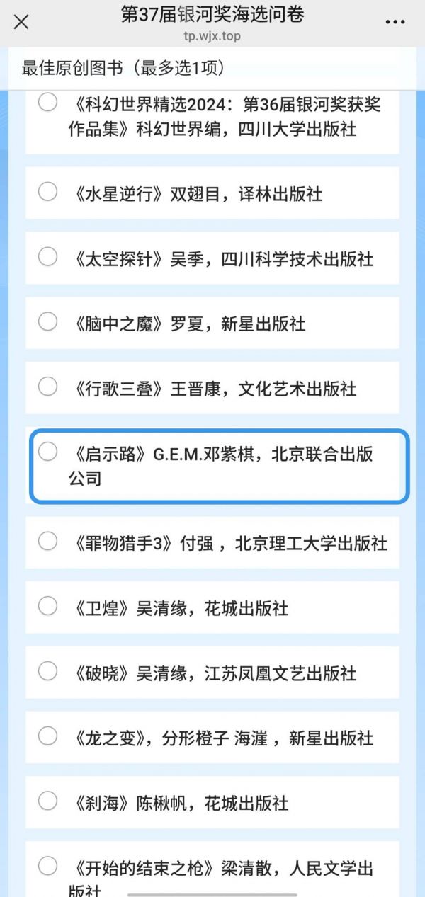 组委会还表示,第37届银河奖“最佳原创图书”奖项面向2025年度全国范围内出版的所有简体中文原创科幻图书,所有在该年度正式出版的此类科幻图书均可被提名。因编辑部精力有限,难免存在遗漏,还在投票页面设置“其他”选项,欢迎读者进行补充提名。