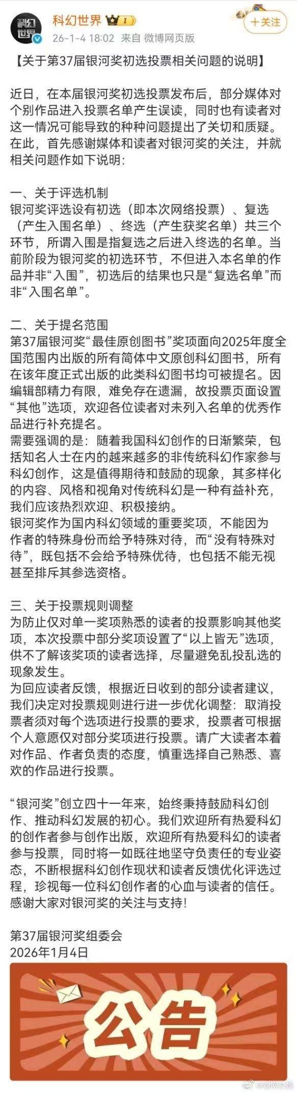1月4日,第37届银河奖组委会发文表示部分媒体对个别作品进入投票名单产生误读,并说明本届银河奖评选设有初选(即本次网络投票)、复选(产生入围名单)、终选(产生获奖名单)三个环节。所谓“入围”是指复选之后进入终选的名单。当前阶段为银河奖的初选环节,不但进入本名单的作品并非“入围”,初选后的结果也只是“复选名单”而非“入围名单”。