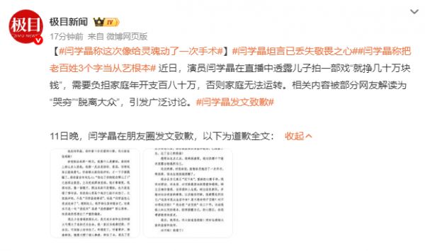 11日晚,闫学晶在朋友圈发文致歉,以下为道歉全文: