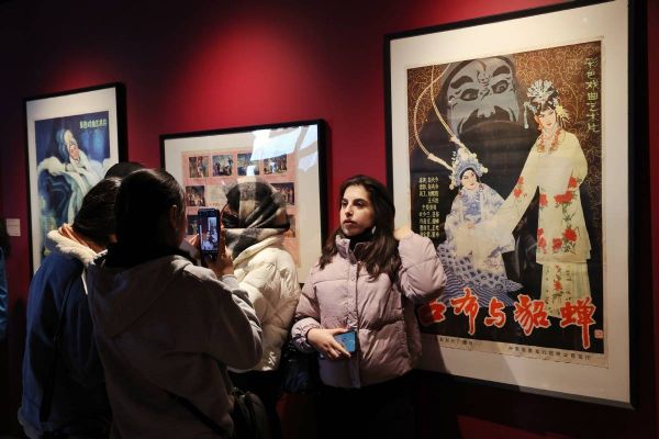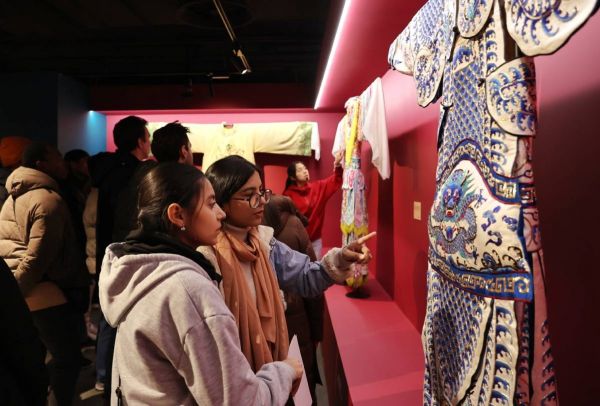 1月26日,外国友人参观“百年风华·国粹新声”京剧艺术主题展。中国日报记者 姜东 摄