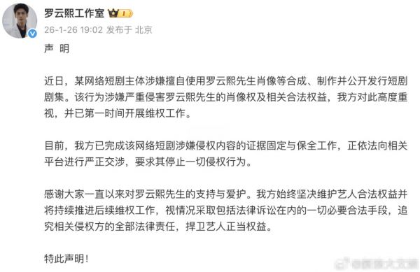 1月26日,罗云熙工作室针对某网络短剧相关主体涉嫌擅自使用罗云熙的肖像进行合成、制作,并公开发行相关短剧剧集的行为发布声明称:“目前,我方已完成该网络短剧涉嫌侵权内容的证据固定与保全工作,正依法向相关平台进行严正交涉,要求其停止一切侵权行为。”