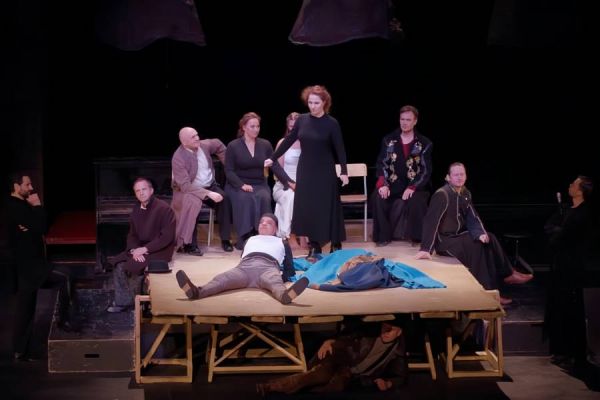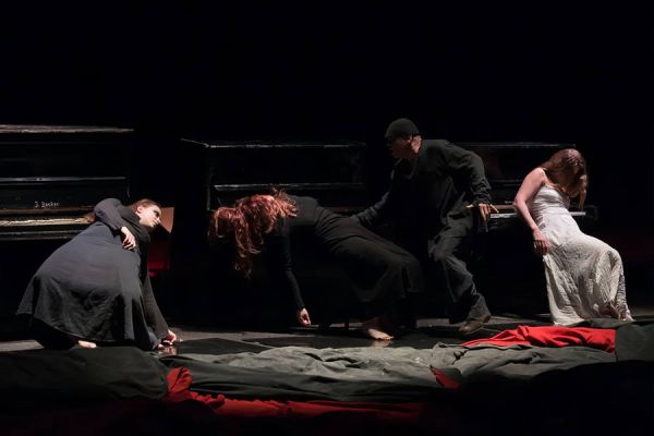 全剧最具颠覆性的结尾,在高清镜头下呈现出震撼人心的悲剧力量。舞台中央并列摆放着三架破烂钢琴,琴键发黄脱落,琴身布满划痕与污渍,仿佛被岁月与暴力摧残殆尽。三个女儿的尸体被放置在钢琴之上,高纳里尔与里根的尸体僵硬地躺着,科迪莉亚的双手自然垂落,指尖轻触琴键。李尔王试图将女儿们的尸体扶起,双手颤抖着托住她们的肩膀,却因力量耗尽或尸体的沉重,每次扶起任何一个女儿,她们的身体都会滑落,重重地压在钢琴键盘上,发出沉闷的撞击声与琴键的刺耳杂音,振聋发聩。