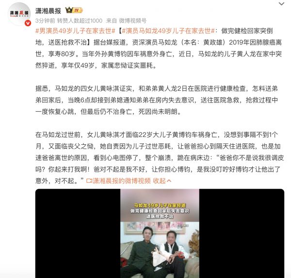 资深演员马如龙儿子家中猝逝,做完健检回家后突然倒地,年仅49岁
