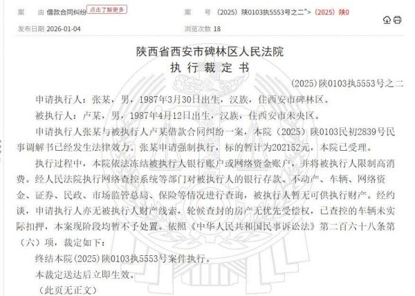 据记者从中国裁判文书网了解到,碑林区法院发布的《执行裁定书》显示,在案件(2025)陕0103执5553号之二中,张玉浩于2025年12月15日申请强制执行,执行标的暂定为202152元,并且法院已经受理此案。在执行过程中,法院依法冻结了卢鑫的银行账户和网络资金账户,并限制了其高消费行为。法院通过执行网络查控系统对卢鑫的银行存款、不动产、车辆、网络资金、证券、民政、市场监管总局、保险等方面的情况进行了全面查询,但并未发现卢鑫有任何可供执行的财产。同时,经过约谈,申请执行人张玉浩也未提供新的财产线索。法院查控的车辆并未实际扣押,且目前没有优先受偿权的房产可以轮候查封。法院最终裁定:终结(2025)陕0103执5553号案件的执行程序。