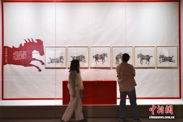 2月24日,浙江杭州,游人观赏展出的昭陵六骏图案。近日,浙江博物馆推出“百骏迎祥——丙午新春马文化特展”,不少游人前来参观打卡。中新社记者 肖健 摄