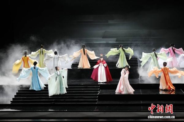 2月25日晚,浙江小百花越剧团《我的大观园》在台湾桃园展演中心上演,这是该剧团时隔近15年再度来台献艺。图为剧中贾宝玉与金陵十二钗的同框场景。中新社记者 刘大炜 摄