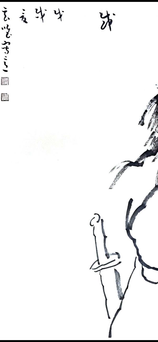 这幅画作笔墨苍劲,寥寥数笔勾勒出一位手持宝剑、神情肃穆的高士形象,颇有“金刚怒目”或“降魔除障”的气势。结合《法华经》中“开权显实”、“会三归一”的核心思想,以及画中人物手持利剑的意象,以此因缘而创作五言律诗:
