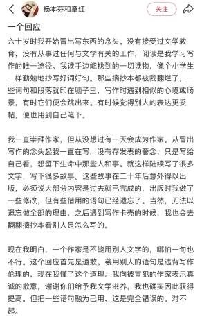2月25日晚,杨本芬就抄袭争议在社交平台承认抄袭行为,并发文致歉:“现在我明白,一个作家是不能用别人文字的,哪怕一句也不行。这个回应首先是道歉。袭用别人的语句是违背写作伦理的,现在我懂了这个道理。”