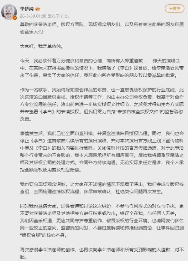 30日凌晨,单依纯发长文向李荣浩道歉,她称此次巡演的曲目版权审核、授权申请等工作,均由主办公司全权负责,自己演出前未进一步核实授权文件细节,之后才得知主办方实际并未签署《李白》的表演授权。“但我仍需为‘自身未亲自核查授权文件’的监督疏忽负责。”