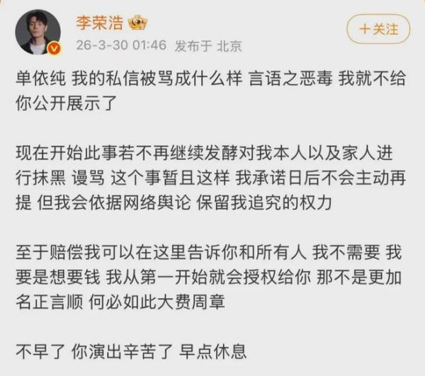 李荣浩很快作出回应,“单依纯,我的私信被骂成什么样,言语之恶毒,我就不给你公开展示了”,他表示,“现在开始,此事若不再继续发酵对我本人以及家人进行抹黑、谩骂,这个事暂且这样,我承诺日后不会主动再提,但我会依据网络舆论,保留我追究的权力”。