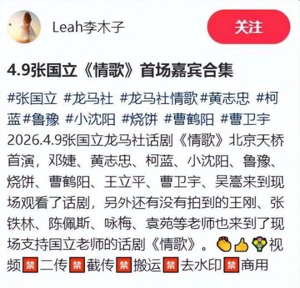 说到柯蓝与黄志忠,这种相处模式也令人欣赏。不被婚姻形式束缚,十五年如一日仍能保持默契与亲密,在绯闻横飞的娱乐圈中难能可贵。无需一纸婚书绑定,两个人都能自在舒适,这种状态反而比很多为了结婚而结婚的关系更长久、更安稳。 《情歌》首演大获成功,台下掌声不断,观众好评如潮。演出将在北京持续至4月12日,随后还将巡演至深圳等城市。喜爱张国立、热爱优质话剧的观众,这场舞台盛宴绝对值得亲自去现场感受。