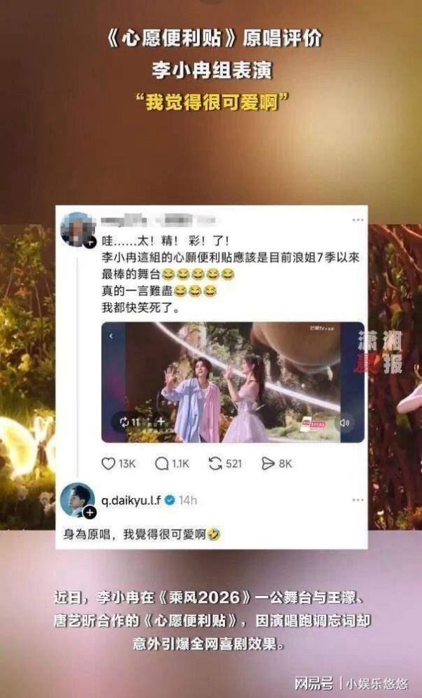 不过被骂之后李小冉的操作也是挺狠的,她没出来哭着喊着去把多努力的自己证明出来,反手直接给吐槽舞台跑调的帖子把赞点了,并且大方说排练累了,休息的时候看会儿搞笑视频去解压是很正常的,她根本是不屑于演那种“熬大夜排练”的敬业人设的,也不顺着网友的思路走,这层潜规则就被直接戳破了。