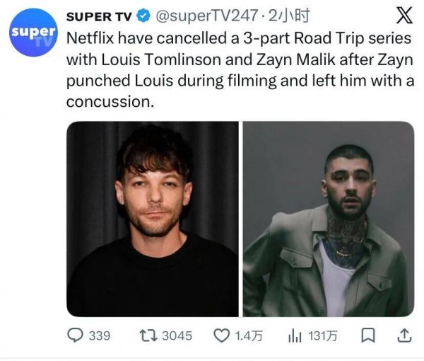 Netflix 在拍摄期间因 Zayn Malik 殴打 Louis Tomlinson 导致其脑震荡而取消了与 Louis Tomlinson 和 Zayn Malik 合作的 3 集公路旅行系列节目。