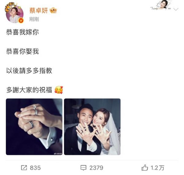 “阿sa”蔡卓妍官宣结婚