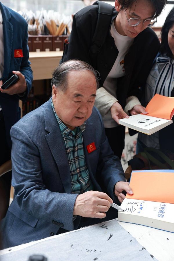 现场书香氤氲,人潮涌动,不少读者和粉丝拿着莫言的作品前来请求签名合照,直播留言中,网友开玩笑称“莫言老师被‘包围’了”“举手,我要向大网红提问”……