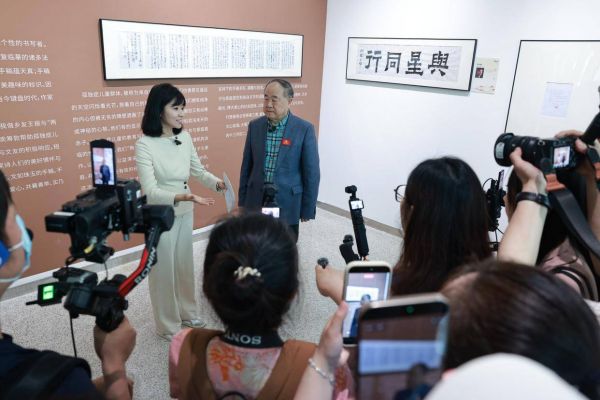 直播从展览序言开启。步入展厅,谈及此次展览,莫言向广大网友解读道:“作家、诗人并不一定是书法家,但一定是具有鲜明个性的书写者。”他追述说,在中国书法史上,被一代代书法爱好者反复临摹的诸多法帖,基本上都是文人即兴创作的手稿。“手稿见性情,手稿蕴天真,是研究作家、理解作品的重要物证,也是时代书法审美趣味的标识。”在键盘书写日益普及的当下,这些手稿愈发珍贵,收藏价值日益凸显。